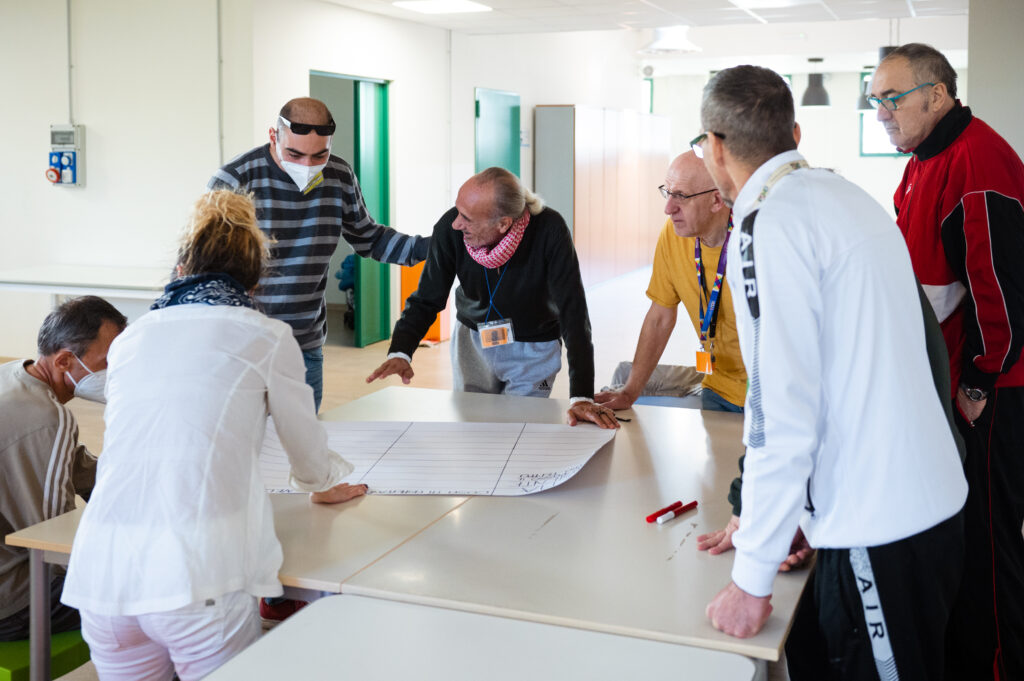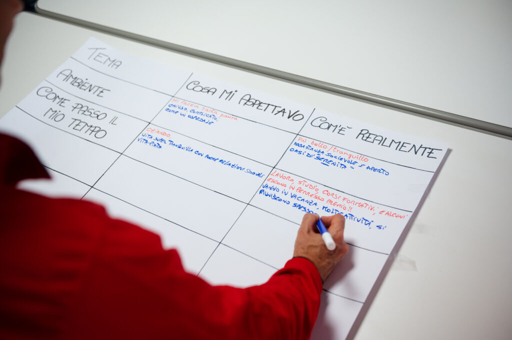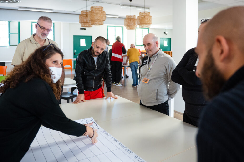 Durante gli incontri gli ospiti del Camaleonte portano con sé e condividono con le persone ristrette i lavori in cui si impegnano nel centro diurno, condividono i pensieri emersi durante queste attività e invitano il gruppo di Opera a fare lo stesso. Si innesca così tra i partecipanti una dinamica di reciproco ed empatico ascolto. Inoltre, attraverso disegni, giochi di ruolo etc., vengono espresse le emozioni messe a tema durante gli incontri all’interno del carcere.