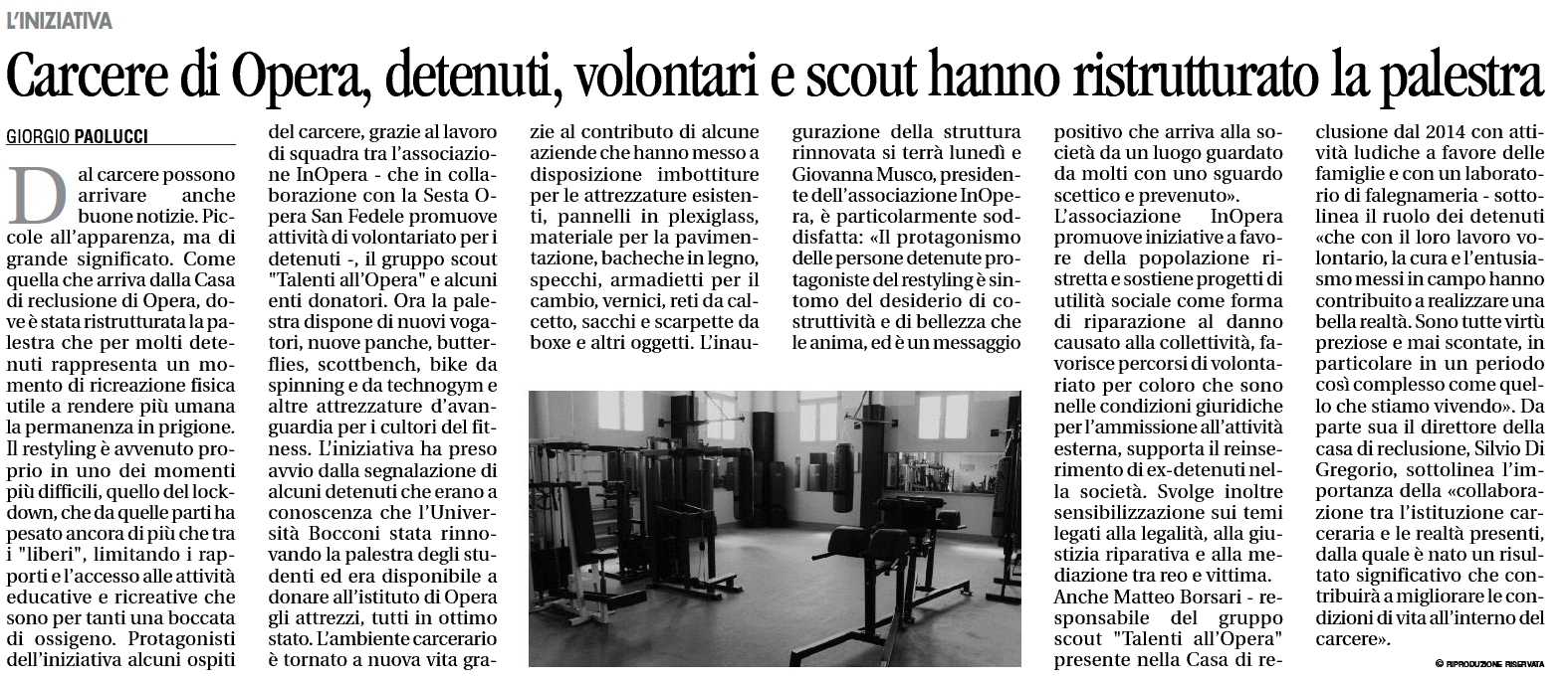 Il 7 giugno 2021 è stata inaugurata la nuova Palestra della Casa di Reclusione di Milano-Opera che è stata ristrutturata grazie alla preziosa collaborazione tra il gruppo Scout Talenti all’Opera e l’Associazione In Opera.