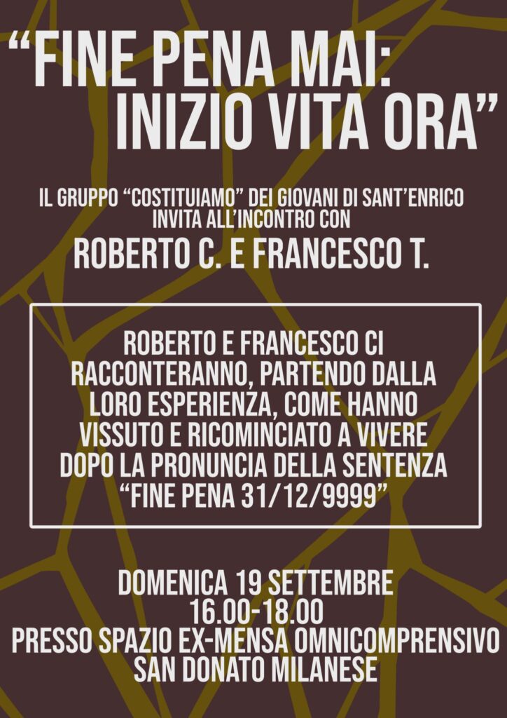 Domenica 19 Settembre 2021 la nostra Associazione ha partecipato ad un incontro organizzato dal gruppo “Costituiamo” dei Giovani della Parrocchia di S. Enrico (San Donato Milanese) presso lo spazio ex-mensa omnicomprensivo di San Donato Milanese. All’incontro, dal titolo Fine pena mai: inizio vita ora hanno partecipato due nostri associati, Francesco e Roberto, che hanno raccontato del lungo percorso che li ha portati dalla reclusione alla possibilità di poter riallacciare i legami con la società civile.